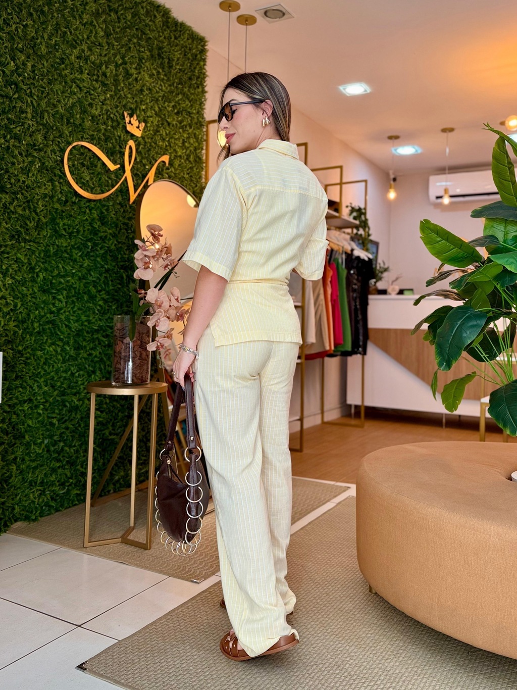 Calça feminina confeccionada em tecido leve com caimento fluido. Apresenta estampa de listras finas, modelagem reta, cós com passantes, bolsos laterais e fechamento frontal por botão e zíper. O tons candy color traz delicadeza e frescor, ideal para composições modernas e alegres.